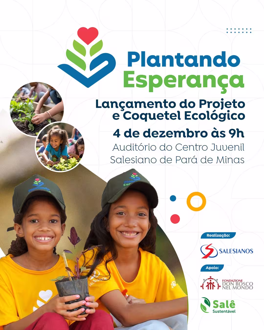 O Centro Juvenil Salesiano, localizado no Patronato Salesiano, em Pará de Minas (MG), lança no dia 04 de dezembro, quinta-feira, às 9h, o Projeto Plantando Esperança. A iniciativa integra o Movimento Dom Bosco Green e tem como objetivo promover ações de cuidado com a Casa Comum por meio do cultivo sustentável de frutas e hortaliças.